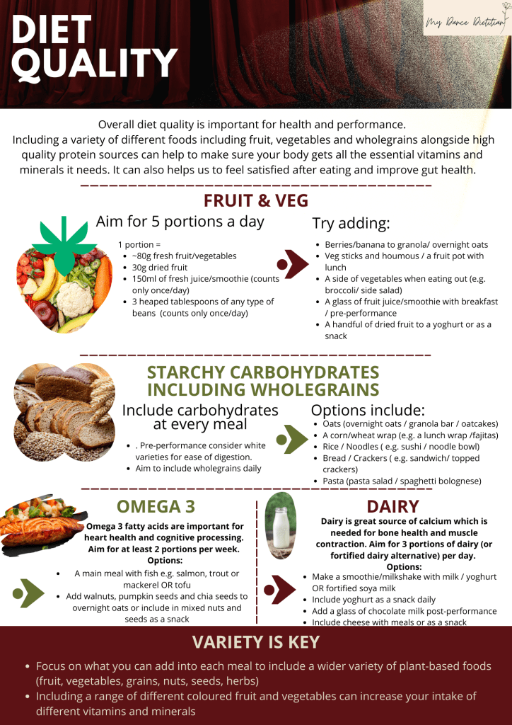 Dancers – Diet Quality Posted bySarah Smales9th Feb 2025Posted inDance NutritionTags:Dance Nutrition, dancers diet, dietitian, performance nutrition Share this: Click to share on X (Opens in new window) X Click to share on Facebook (Opens in new window) Facebook Like Loading... Related Published by Sarah Smales Specialist Dietitian, Ex-professional Dancer and Yoga Teacher View more posts